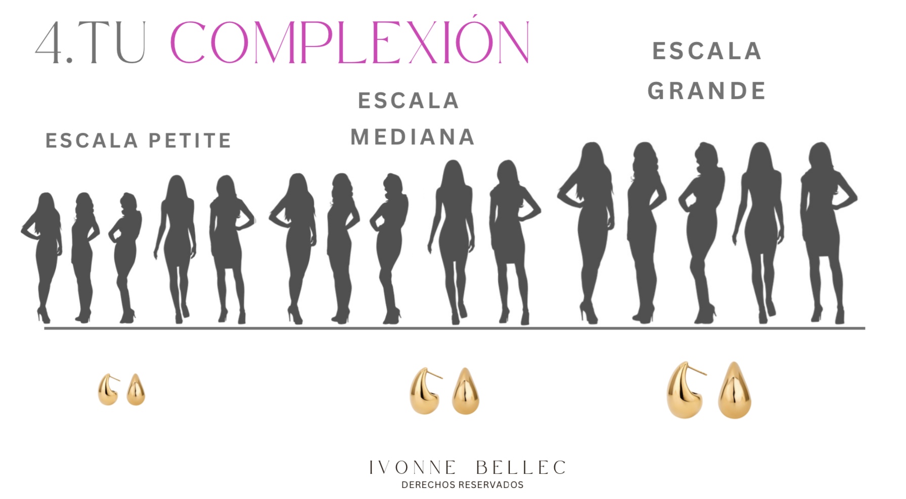 La cuarta Columna de tu imagen es Tu Complexión. La regla de Elegancia cambia para cada tamaño de cuerpo. Cada accesorio, cada estampado, cada objeto que tienes en tus manos, debe corresponder a la ley de la ESCALA : la armonía entre el tamaño de tu cuerpo (tu complexión) y el tamaño del objeto que te acompaña.