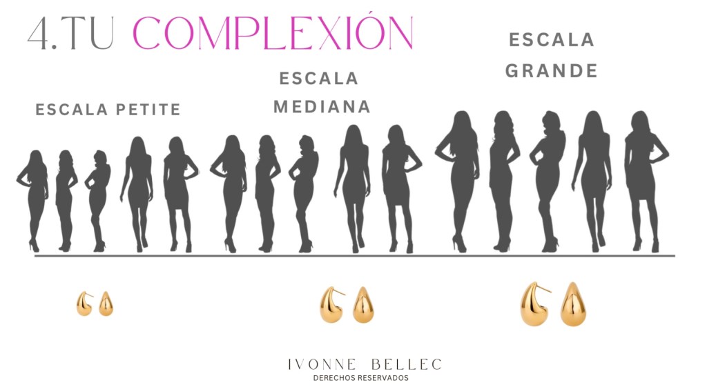 –> Si tienes una estatura bajita y eres menudita ( escala mujer Petite) entonces tus accesorios (aretes, collares, pulseras, cinturones, celulares, plumas, bolsas, libreta de notas,etc) deberán ser de escala PETITE también para respetar TU escala y provocar Armonía, traducida en Elegancia.